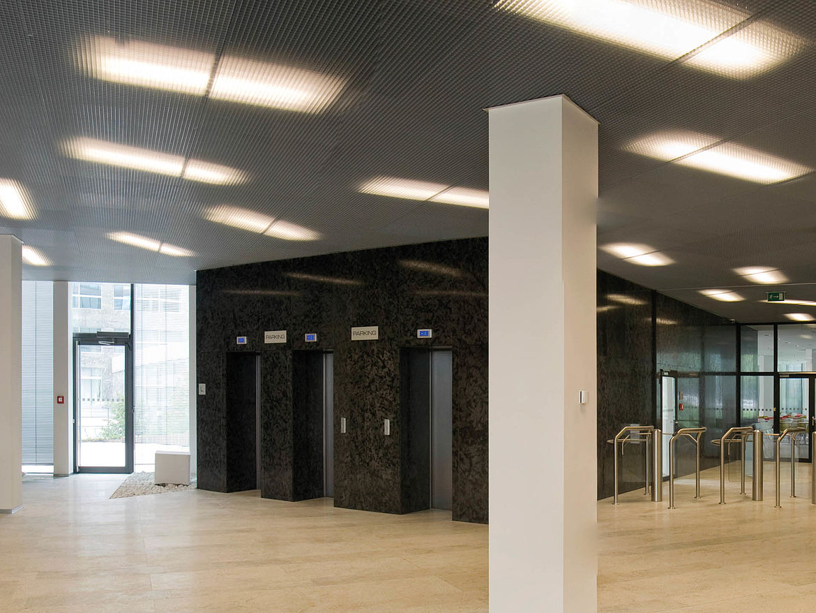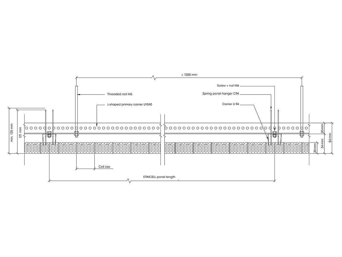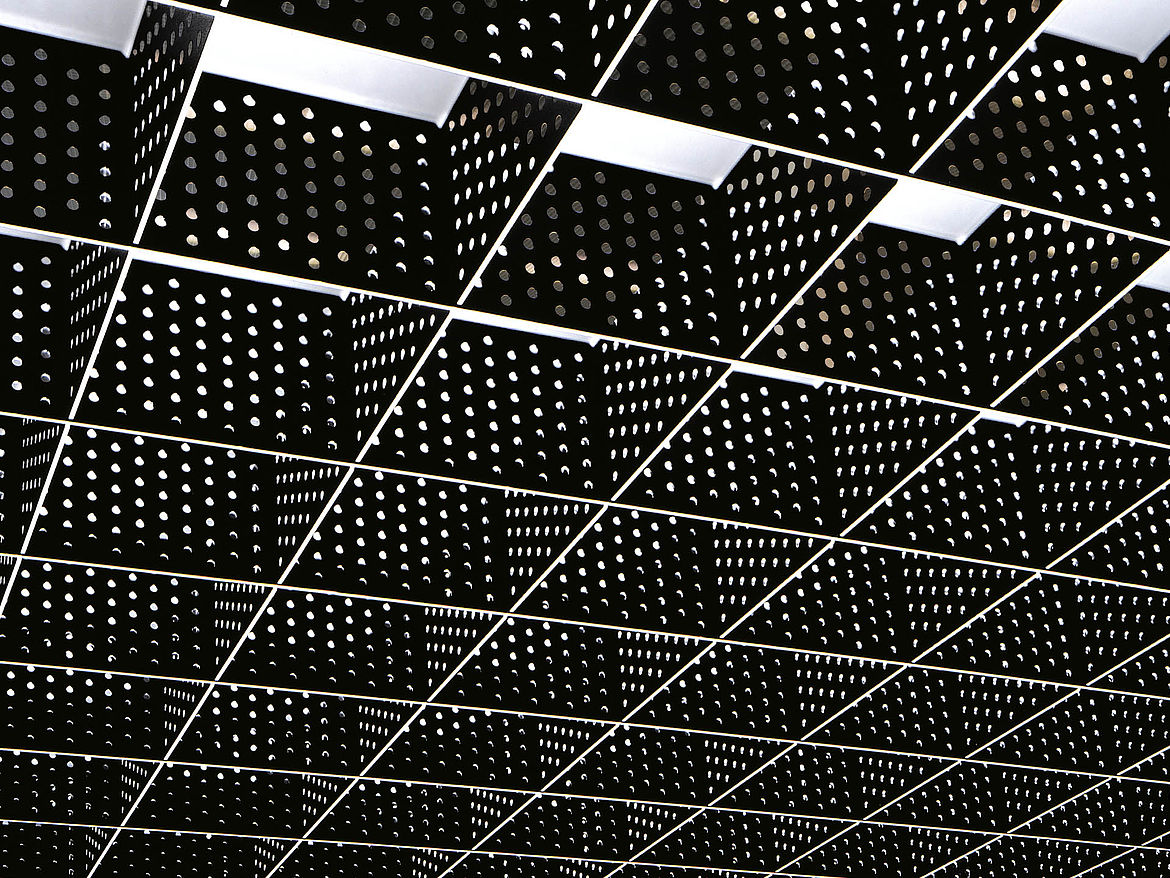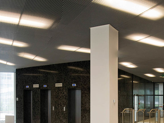 Le plafond alvéolaire simple peau ETINCELL est idéale pour les projets qui imposent des exigences particulières à un plafond décoratif. La perforation des alvéoles crée des réflexions qui peuvent être utilisées pour diriger la lumière.