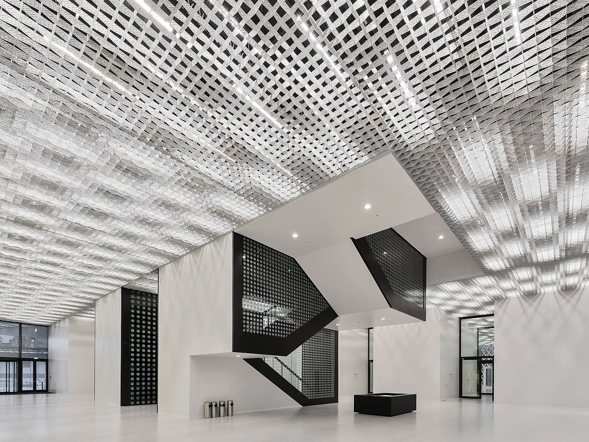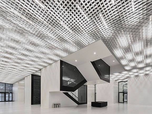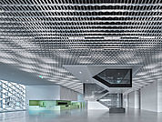 La disposition des lames ondulées et posées en quinconce confère au plafond multidirectionnel QUADRA-DECOR son caractère moderne et aérien. La perforation irrégulière des lames soutient la diffusion de la lumière.
