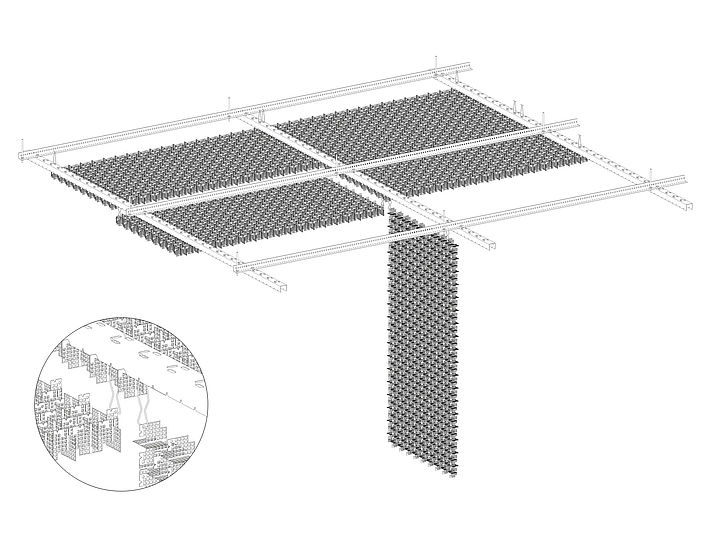 Le plafond multidirectionnel TICELL-N doit sa spécificité au tissage de ces lames perforées, ce qui permet à la lumière de se refléter. Le résultat donne une apparence visuelle singulière et captivante. Ce plafond alvéolaire moderne est particulièrement bien adapté aux projets qui favorisent un design original.