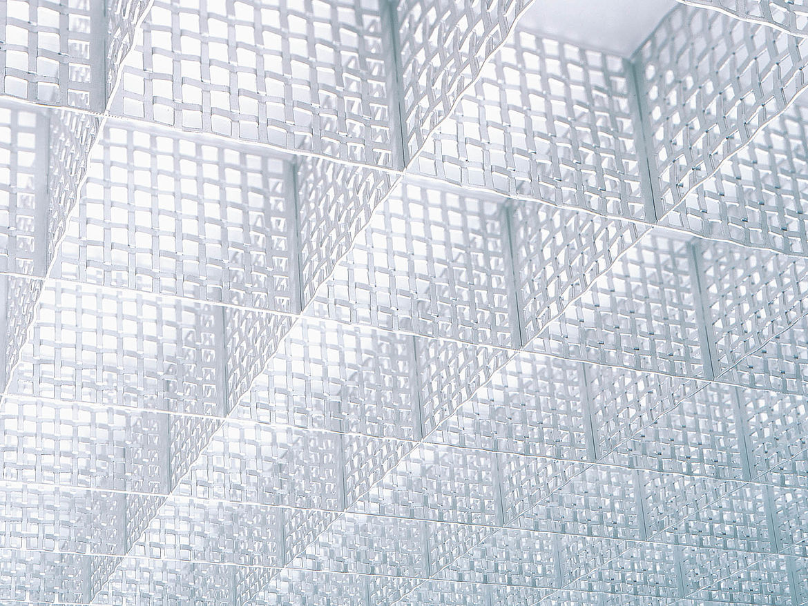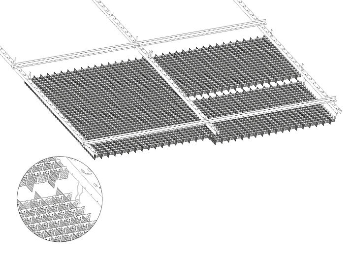 Le plafond alvéolaire simple peau TICELL est un modèle «tissé» pour assurer à chaque projet un design individuel d’une légèreté métallique et moderne. La surface des lames en aluminium est structurée par un procédé spécial afin que les arêtes poinçonnées reflètent la lumière ce qui donne un effet visuel singulier.